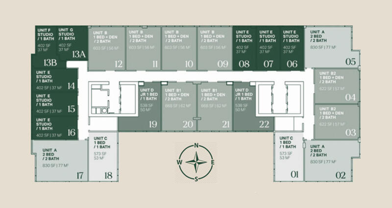 | Unidad B - Lineas 09, 10, 11, 12 | 1 Hab + Den / 2 Baños (643 SF) |